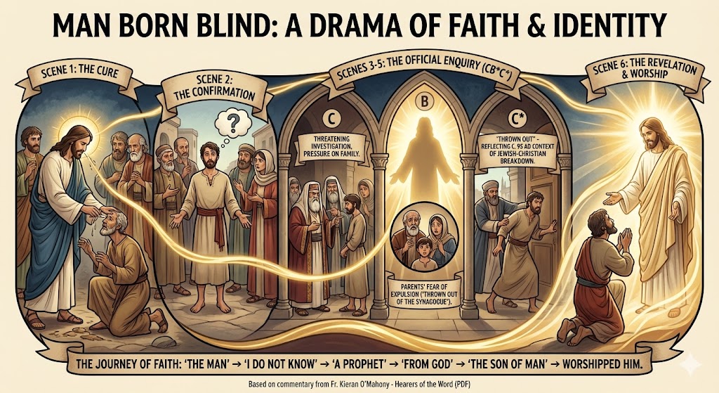PEASBWITU (05:17) – In this short Lenten reflection for the Fourth Sunday of Lent (March 15, 2026), Mike Fletcher, a Catholic from Ontario, Canada meditates on Divine Vision & Path of Light — drawing from the Gospel reading John 9:1–41 (the healing of the man born blind), where Jesus declares “I am the light of the world” and opens eyes to physical and spiritual sight.