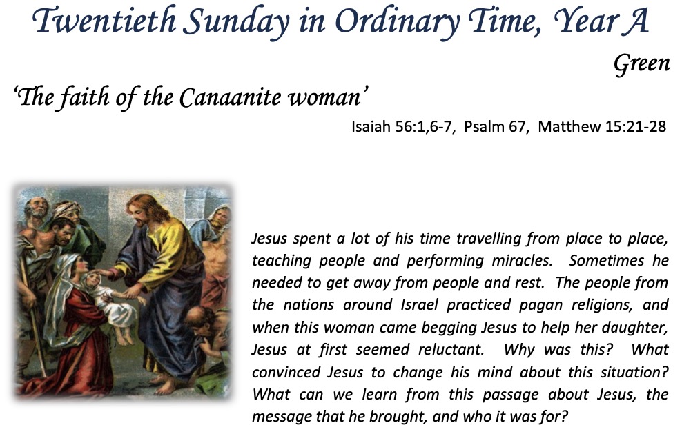 The Canaanite woman confronted the evils of discrimination in todayβs Gospel. As a family, explore the topic of discrimination. Watch the evening news together. After the news, discuss the stories of discrimination in the newscast and what can be done about these situations. Talk about how faith plays a role in dealing with the evils of discrimination.