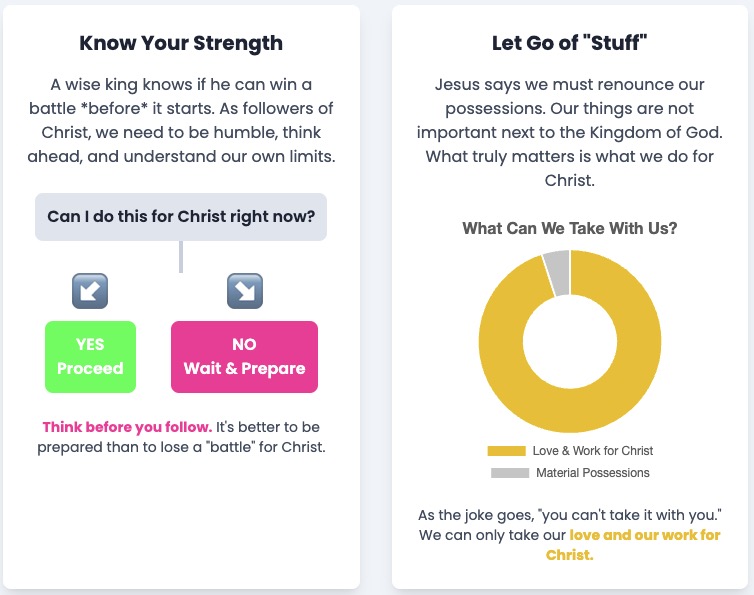 - What is the main lesson from the stories about the tower builder and the king? a) You should never start big projects. b) It's important to win every battle. c) You should think carefully about what it means to follow Jesus before you decide to. d) Kings are smarter than builders.
