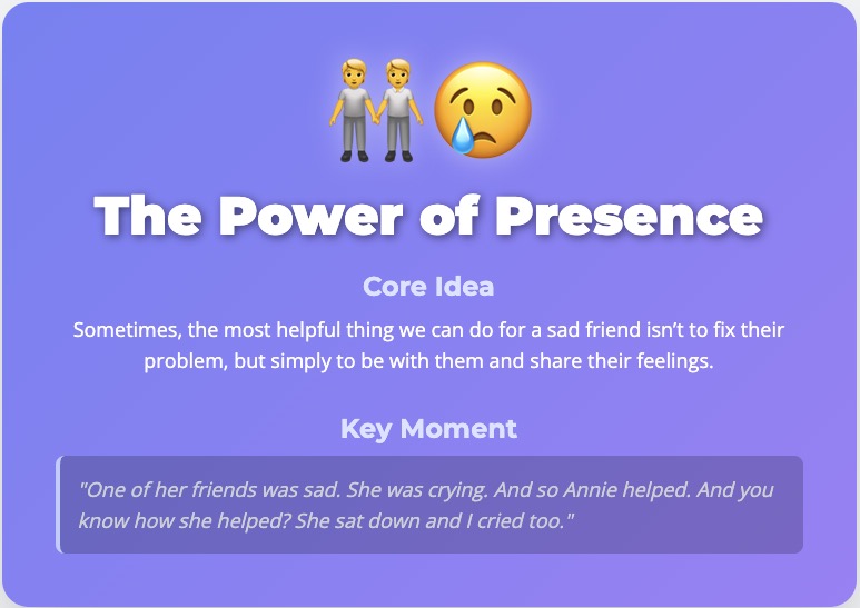 Core Idea: Sometimes, the most helpful thing we can do for a sad friend isn’t to fix their problem, but simply to be with them and share their feelings.