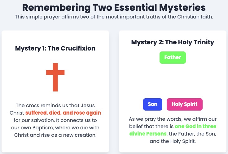 A: The Sign of the Cross is a sacramental that prepares believers for grace in the sacraments and prayers, expressing belief in God and remembering two key Christian mysteries: the crucifixion and the Holy Trinity.
