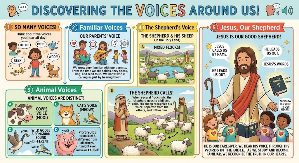 In the Holy Land shepherds, caregivers of sheep, bring their flocks to a place where the animals can drink water. Several flocks of sheep mix together. When it is time to leave the area the shepherd goes to a hill and calls his sheep. They recognize his voice, separate out from the other flocks, and follow him.