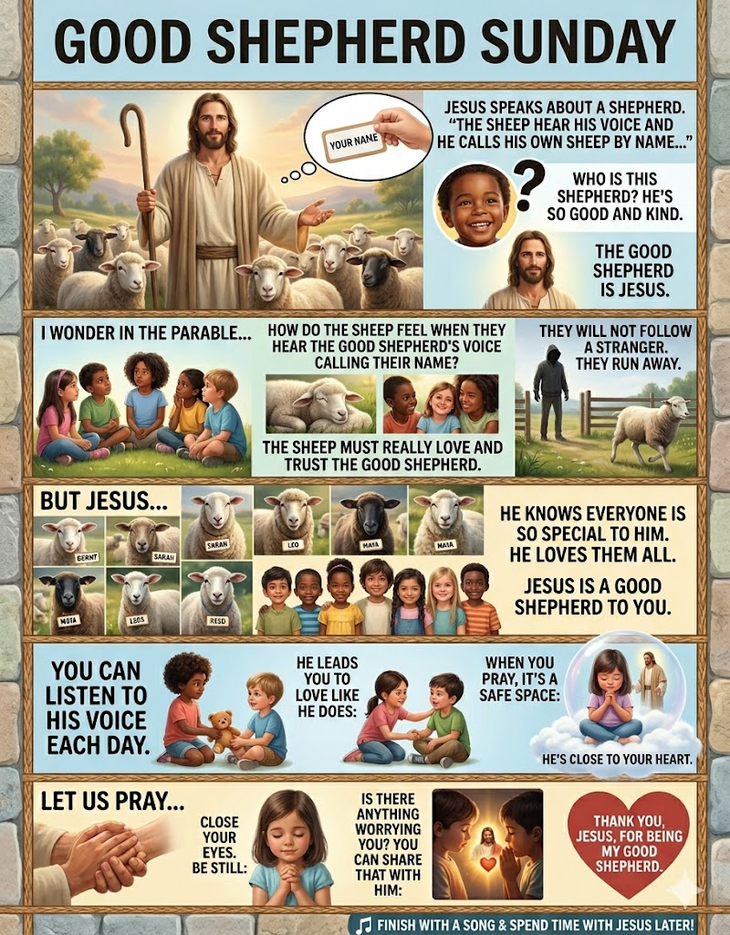 Q: How can we follow Jesus’ example as the Good Shepherd this week? A: Be a good shepherd by being loving, caring, and grateful; help take care of family, pets, or neighbors, following Jesus’ example of sacrificial care.