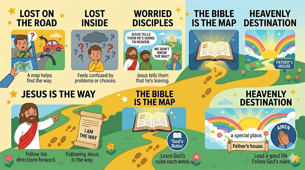 Q: What does Jesus mean by calling himself “the way, truth, and life”? A: Jesus identifies himself as the way, truth, and life who guides followers to eternal life in heaven through his teachings, as revealed to his disciples the night before his death.