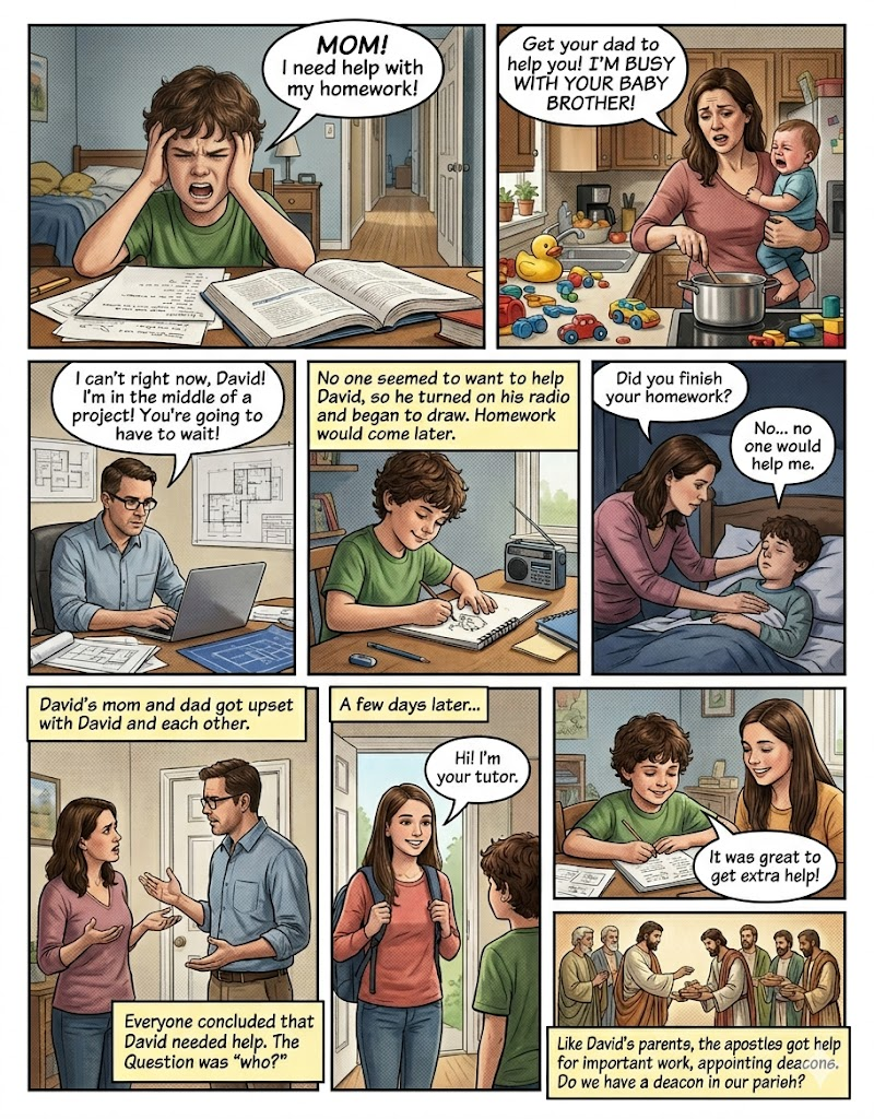 What does the term “deacon” mean and what do deacons do? The word deacon comes from the Greek word “diakonos,” which means “servant” or “minister.” The Apostles appointed the original seven deacons in the Book of Acts (Acts 6) to assist them in serving the Church. Originally, they were appointed to care for the widows of the community, feed the hungry, and help distributing communion in the breaking of the bread.