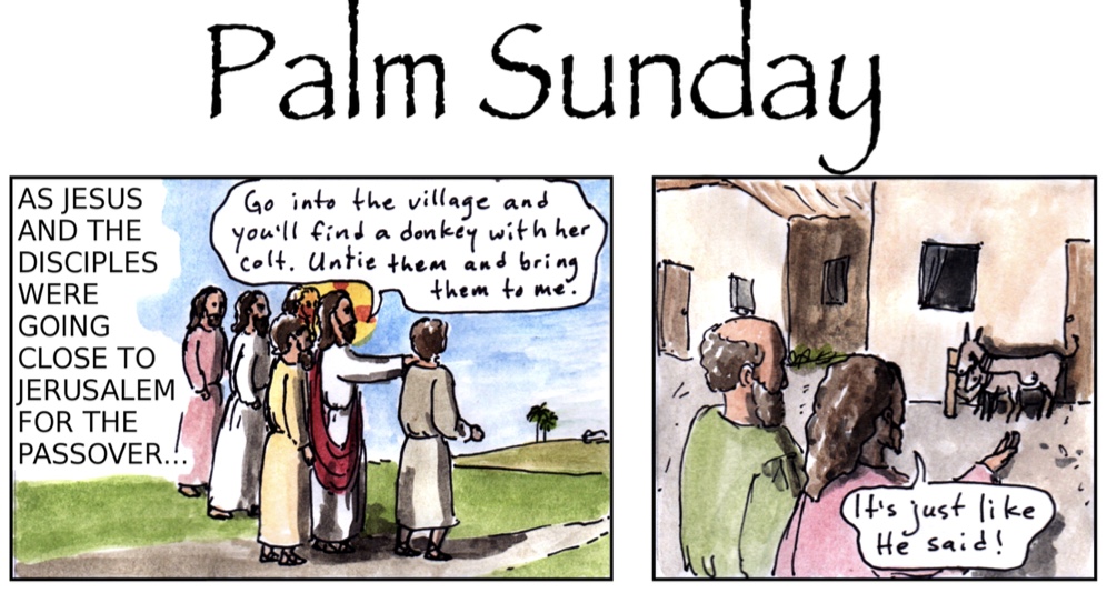 Jesus sent two of his disciples ahead to a nearby village to fetch a donkey and a colt for him to ride on when he entered Jerusalem.