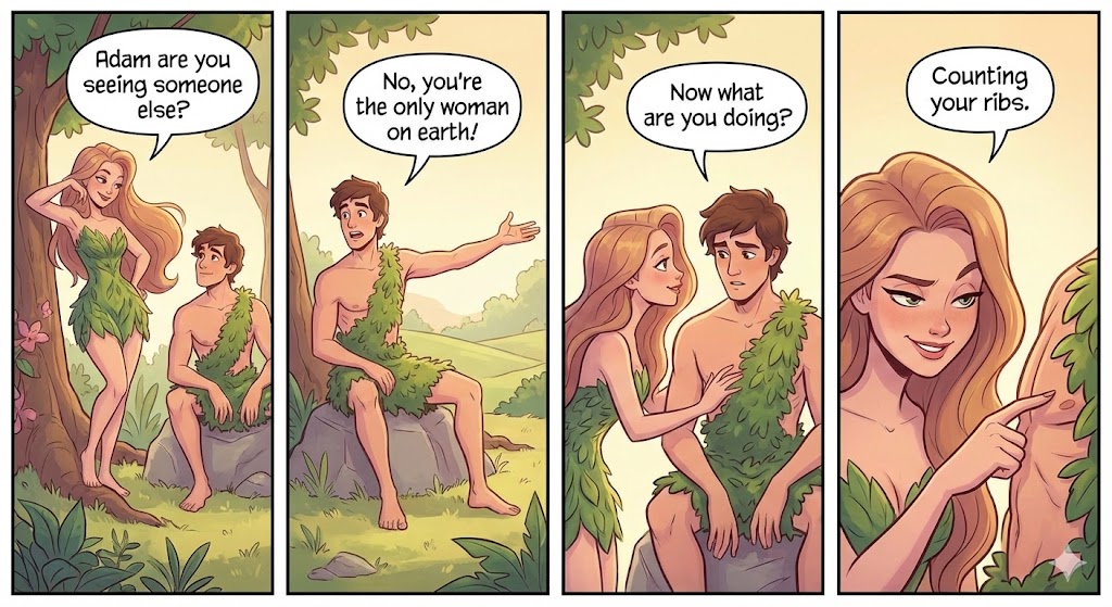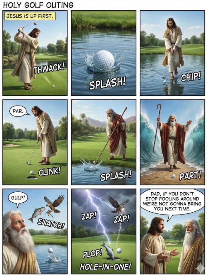 SOURCE: Comic panels were created using AI based on anecdotes/jokes found at Father Tony’s Homilies. Permission is given for them to be freely copied in any publication for non-commercial use.