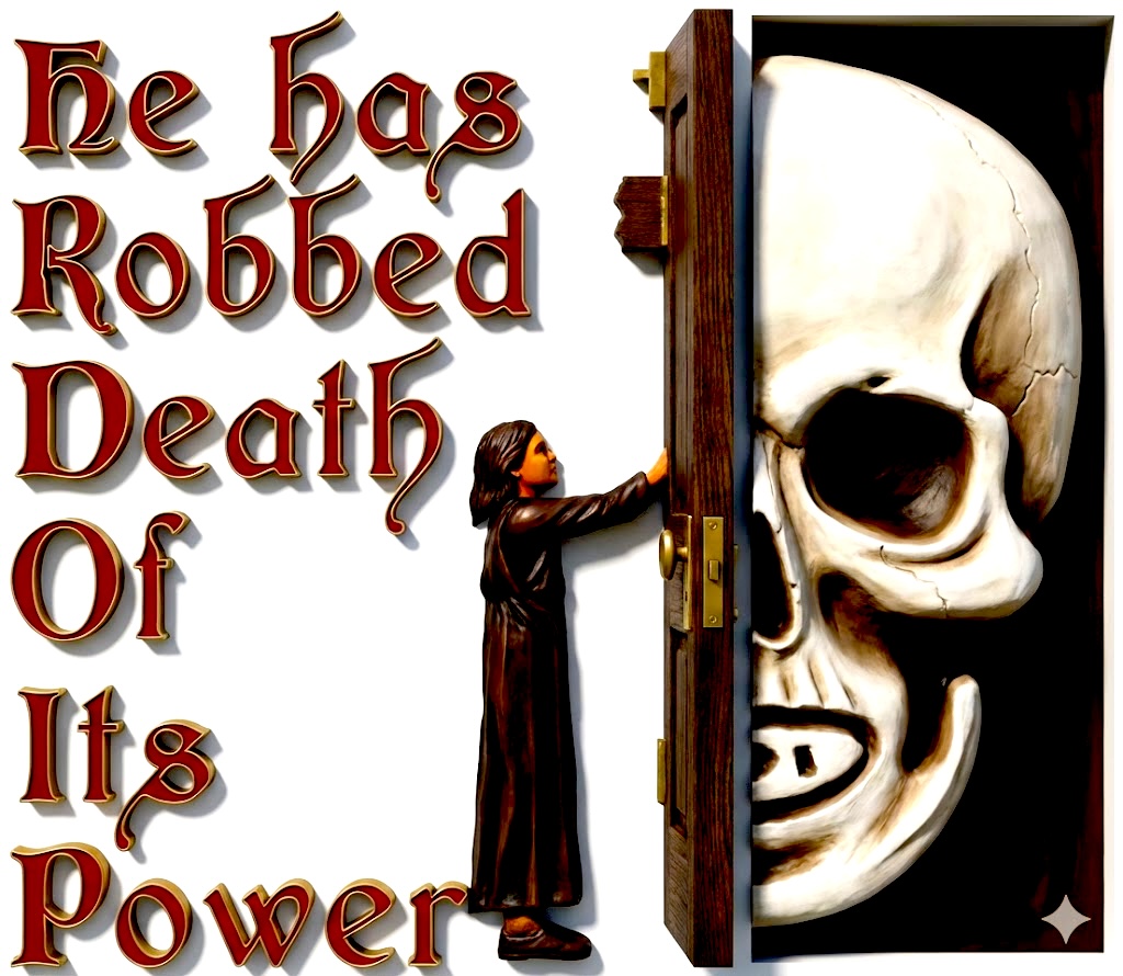 The image is a literal manifestation of Christian assurance. It takes the abstract theological concept of “destroying death” and makes it a tangible action. The believer can boldly shut the door on the darkest, most imposing force in human existence simply because, as the text proclaims, the entity behind the door has already been robbed of its power.