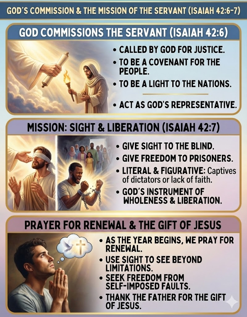 The text on the graphic (“Here is my servant whom I uphold”) is a direct quote from Isaiah 42:1 (the First Servant Song). However, the first reading this week is from, Isaiah 49:5–6, is the Second Servant Song. Because both passages describe the same Messiah and his mission, the graphic fits Isaiah 49 distinctively well.