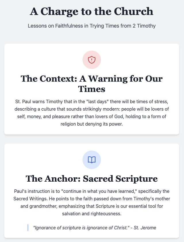 This commentary is a powerful resource for preachers looking to craft a homily on the courage and character required for modern discipleship. It connects the ancient charge to Timothy with the call every believer feels today: to stand firm, proclaim the Word, and teach with unwavering patience and passion.