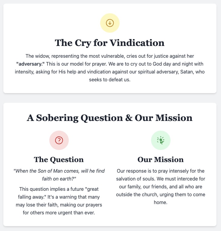 Let’s take this a step deeper. Think of your soul as the widow. You have shed the “old man,” your sinful nature. Your “adversary” is the devil, who constantly accuses and attacks you. When you approach God, the truly righteous Judge, you are pleading your case against this adversary. Your persistence in prayer doesn’t change God’s mind, but it softens and changes your heart, opening it to receive the grace and mercy He is already pouring out for your deliverance.