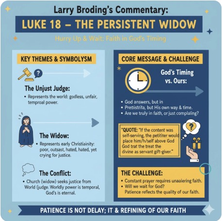Broding moves beyond a simple lesson on persistence, offering a powerful symbolic reading of the parable. He paints a vivid picture of the unjust judge as the godless, unfair world, and the relentless widow as the early Church itself—poor, outcast, and hated, yet crying out for justice. This perspective transforms the story from a personal lesson into a dramatic depiction of the Church’s faith in a hostile world.