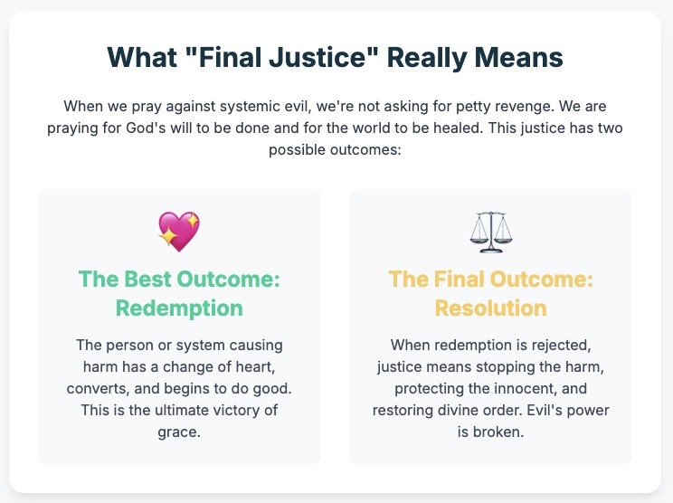 AUGUSTINE When the widow says, “Grant me justice against my adversary,” it explains why God’s chosen people pray for justice. This “justice” for the righteous should be understood as the end of wickedness, which happens in one of two ways: either the wicked convert and become righteous, or they are punished after rejecting their chance to change. Even if every person turned to God, the devil would still need to be condemned at the end of time. Since righteous people are eagerly waiting for this final justice, it’s not wrong for them to be described as wanting “vengeance.”