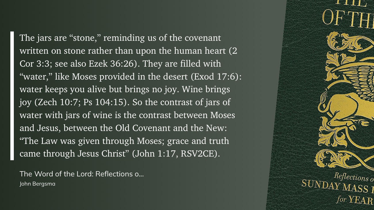 Adulterous Israel is restored to that joyful, innocent age of long ago when she was God’s virgin spouse. This marriage theme evokes thoughts of the marriage feast at Cana (our Gospel reading for today) and the marriage feast of the Lamb (Revelation 21:1-4). The Church, the new Israel, is the bride of Christ as foretold in Hosea 2:16-20 (Hosea 2:18-22 in the New American Bible and New Jerusalem Bible).