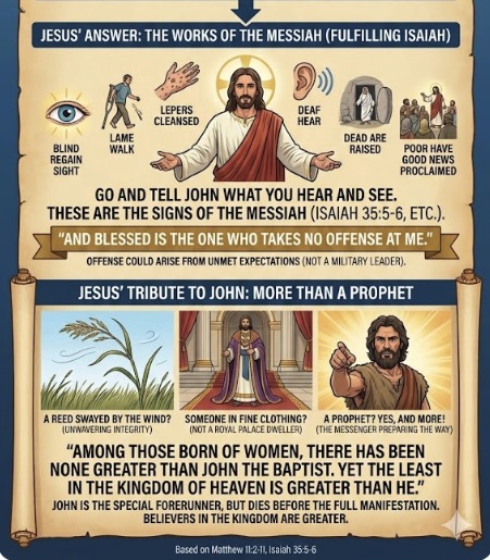 - Jesus asks the crowds what they expected to see when they went out to John in the wilderness, identifying John as more than a prophet, a messenger preparing the way for Jesus.