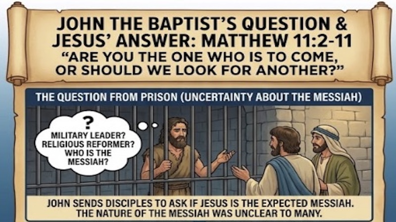 00:00 John the Baptist, imprisoned for denouncing Herod’s sin, sends disciples to Jesus to confirm if he’s the Messiah, while Jesus praises John as a prophet preparing the way for him.