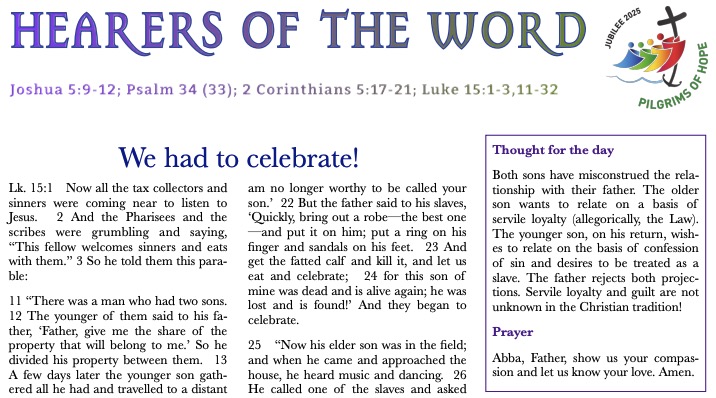 In the first reading, Joshua prepared the people to enter the Promised Land. The days of nomadic survival were over; the time of conquest and settlement were at hand. Just the people celebrated Passover before they passed through the Red Sea to freedom, the people ate the Passover before they crossed the Jordan River into Palestine. So, Passover became a transition ritual. It bid farewell to life in the desert (represented by the manna that disappeared)…