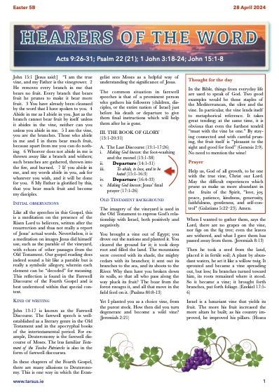 - The passage from John 15:1-8 discusses the imagery of the vine, inviting reflection on our relationship with Jesus, communion as a community of faith, and the practice of discipleship.