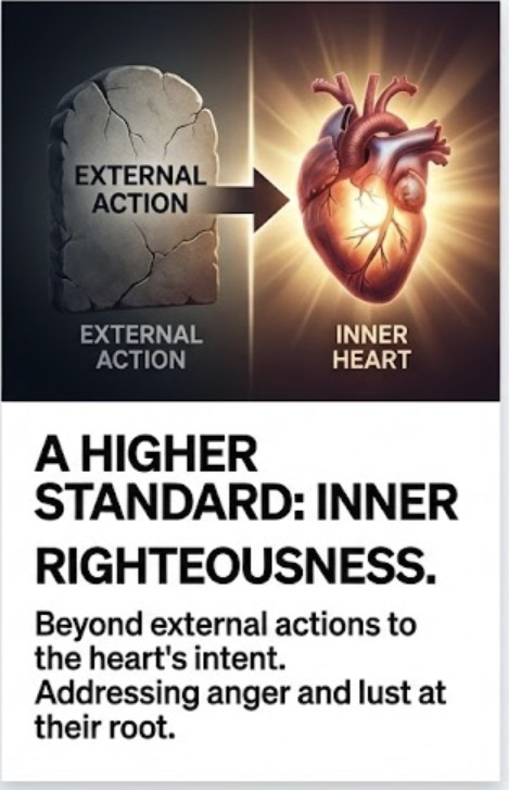 Jesus teaches a higher standard of righteousness in the Sermon on the Mount, emphasizing that true righteousness requires a deeper transformation of the heart and spirit, going beyond outward obedience to internal intentions and a life of mercy, forgiveness, and reconciliation.