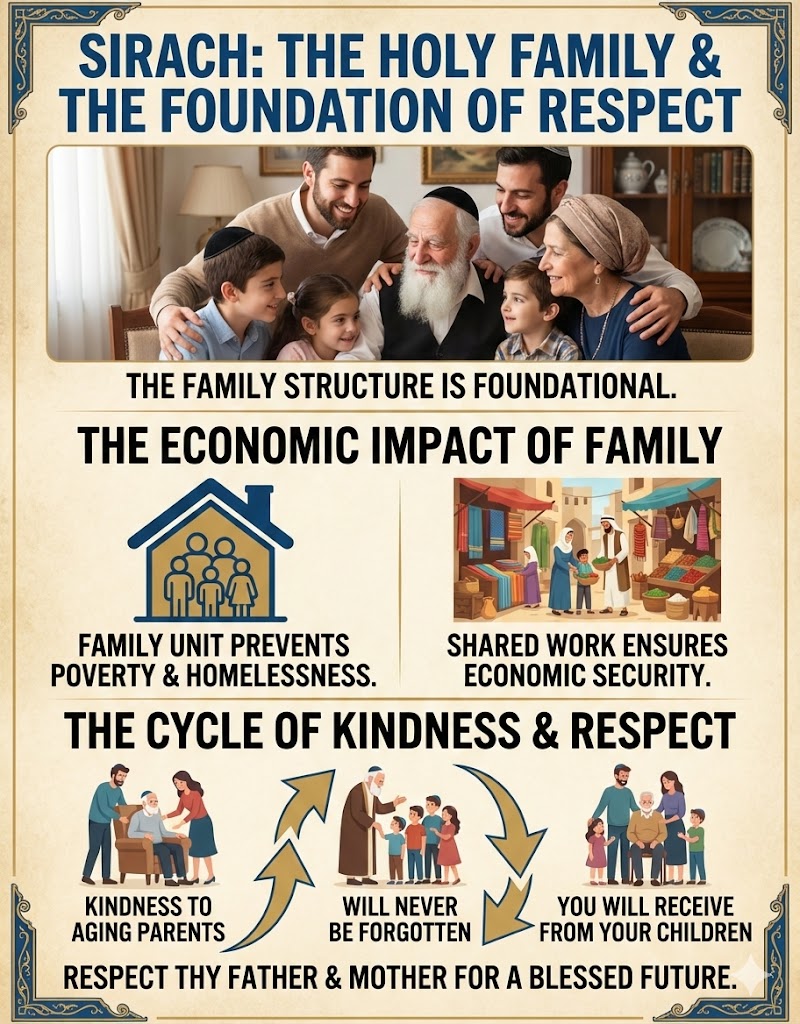 Fr. Galetto contextualizes this passage from Wisdom literature by explaining the critical nature of family structure in the Middle East, both in the time of Jesus and today. He notes that the family unit was an economic necessity that prevented homelessness and poverty, particularly through the tradition of wives joining their husbands’ households to work for the family business. The core message of the reading is the commandment to respect one’s father and mother. Fr. Galetto highlights that this respect must endure even as parents age or face senility, promising that the kindness shown to parents will be returned to you by your own children in the future.