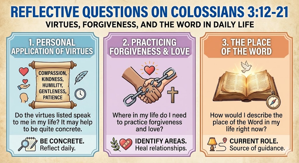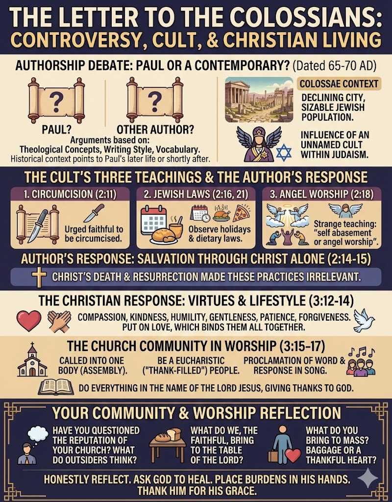 - The Link: It explicitly maps the text of Colossians 3 to the structure of the Mass/Service. It identifies the “Assembly” (Body), the “Word and Homily” (3:16a-b), the “Song” (3:16c), and the “Eucharist” (giving thanks in 3:15/17).