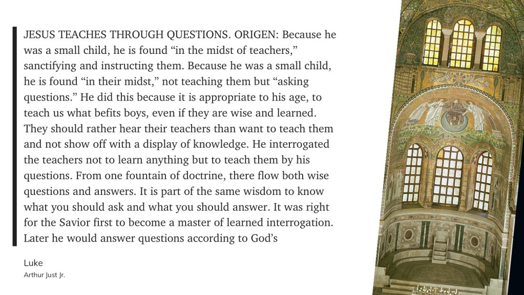 ORIGEN: He wasn’t found immediately because Jesus wasn’t with His relatives or those who knew Him by flesh. Nor was He among the crowds. Instead, learn where those seeking Him can find Him: in the temple. Seek Jesus in the Church and among the teachers in the temple. When you search for Him this way, you’ll find Him. They didn’t find Him among His relatives because human relationships can’t fully understand the Son of God. They didn’t find Him among acquaintances because He’s beyond human knowledge and understanding. Where did they find Him? In the temple! When you seek the Son of God, first search for Him in the temple. Go there, and you’ll indeed find Christ, the Word, and Wisdom.