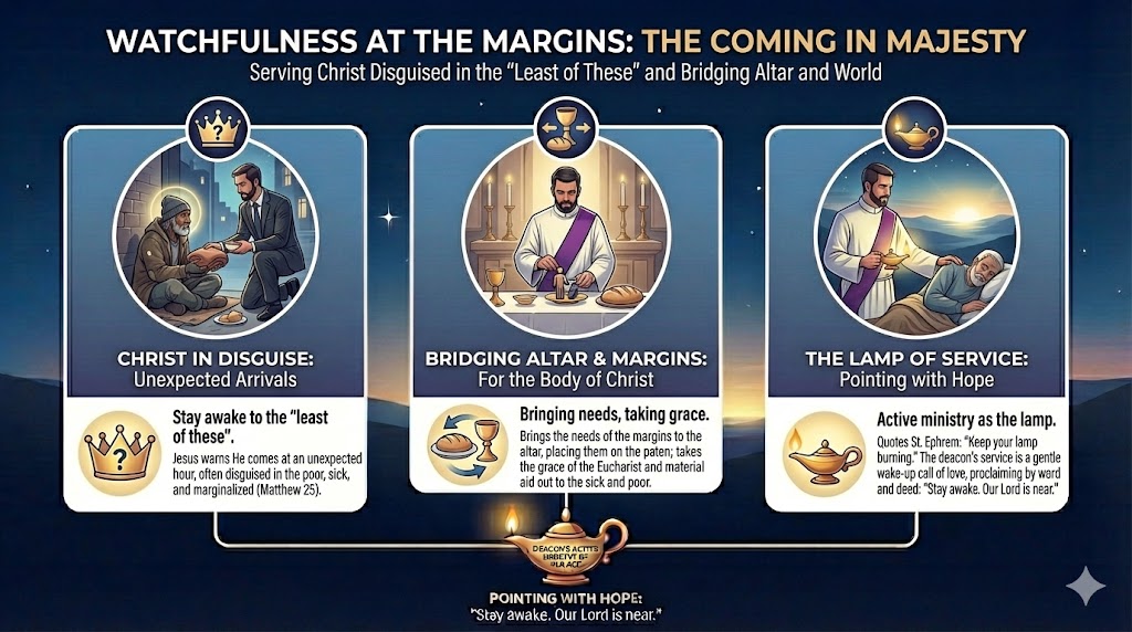 All: Lord Jesus, You have told us to stay awake, for we do not know the day or the hour. Grant your Deacons, and all of us who serve, the grace of the Sentinel. May we be alert at the Altar, reverent before the Mystery. May we be alert in the Parish, recognizing the anxieties of your people. May we be alert at the Margins, finding You in the disguise of the poor. Help us to put on the armor of light, that we may wake the world with the joy of Your coming. Amen.