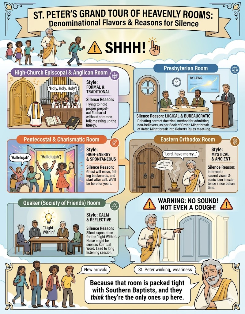 They inched past a large, opulent door made of ancient, dark wood. Peter shot the group a meaningful glare, demanding absolute silence. Through the massive hinges, they could hear the distant, grand swell of a choir singing Holy, Holy, Holy in multi-part harmony, accompanied by the distinct, complex breathing of a very expensive pipe organ, but the sound was muted, and there was no noise of people moving or speaking. It was a place of formal, synchronized quiet. As they passed out of hearing range, one of the new arrivals whispered, “Who’s in there?” St. Peter replied, “That’s the High-Church Episcopal and Anglican Room. They believe we all should have arrived with perfectly ironed vestments and a Book of Common Prayer, and they are trying very hard to hold a very proper and dignified perpetual Eucharist without any of us common folk messing up the liturgy.”