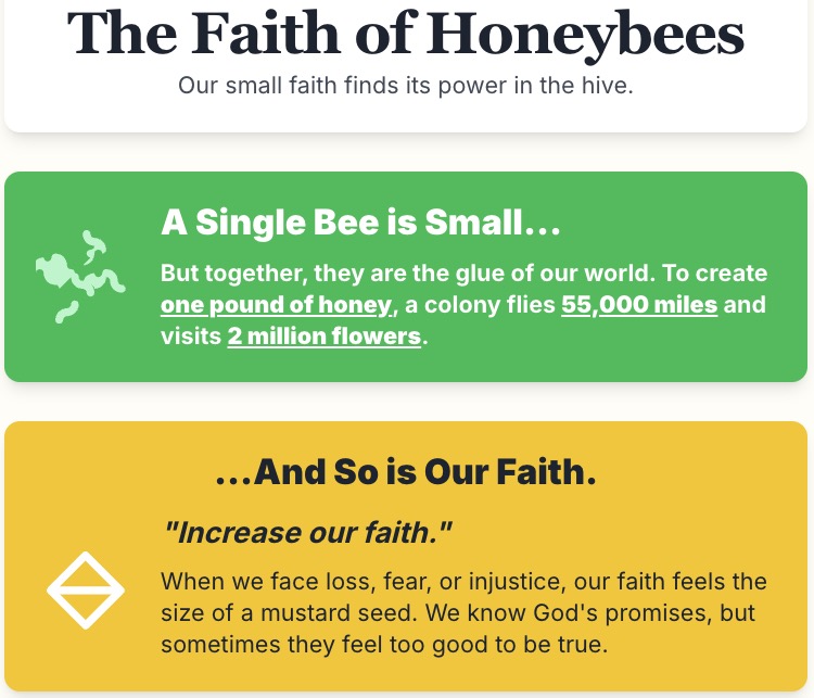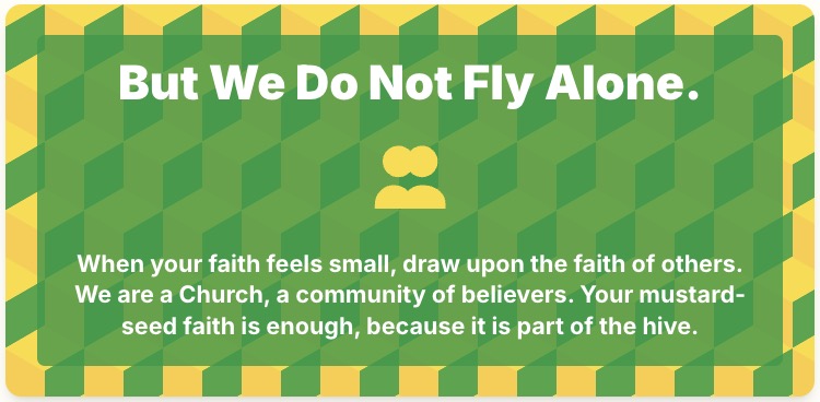 Our faith might be the size of a mustard seed but we are not an isolated plant. We are a Church, a part of a community of believers. As a community of believers, we need to draw upon one another for faith and hope. That is why the honeybee is a useful image. Alone, our faith is much too small. But it is still sufficient. It still has power, because we do not fly alone.