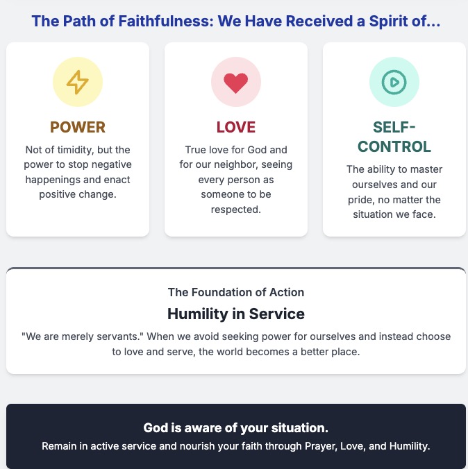 Despite the pervasive violence and injustices in the world, maintaining faith and humility in service can empower individuals to overcome challenges and foster positive change. Faith is essential for overcoming life’s challenges, and we must continually seek and pray for it to strengthen our trust in God.