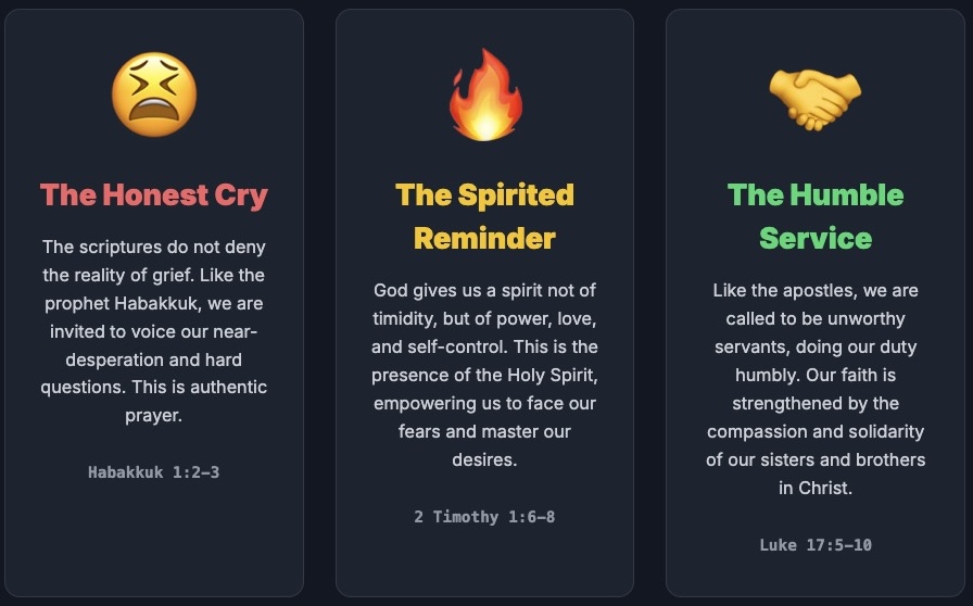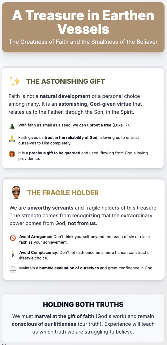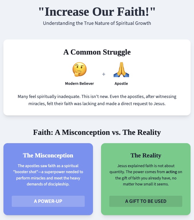 The prophet Habakkuk also struggled with faith amid injustice, learning that the righteous must live by perseverance. This reveals that struggling with faith is not a failure but a normal part of the journey. Faith, a gift from baptism, doesn’t grow from a magical infusion but through trials and tribulations. When we ask God to increase our faith, we are essentially asking for the challenges that build spiritual muscle. Therefore, these struggles are not a sign of weak faith, but rather the growing pains of a faith that is alive and active.