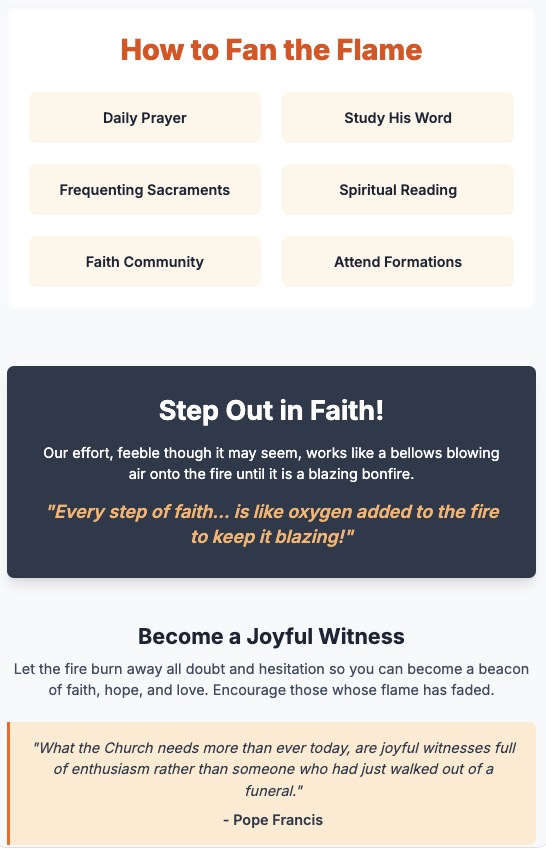 Our Christian faith can be likened to hot coals which would make a fire when fanned but become cold and useless if left alone. Many of us Catholics were baptised as infants, thus becoming Christians before we knew anything at all. Many of us grew up without properly tending that initial spark of faith that was given to us at baptism or we had allowed the pressures and distractions of life to reduce our faith to cold ashes. The result being so many have left the faith of our childhood, the faith of our parents, believing this is no longer relevant.