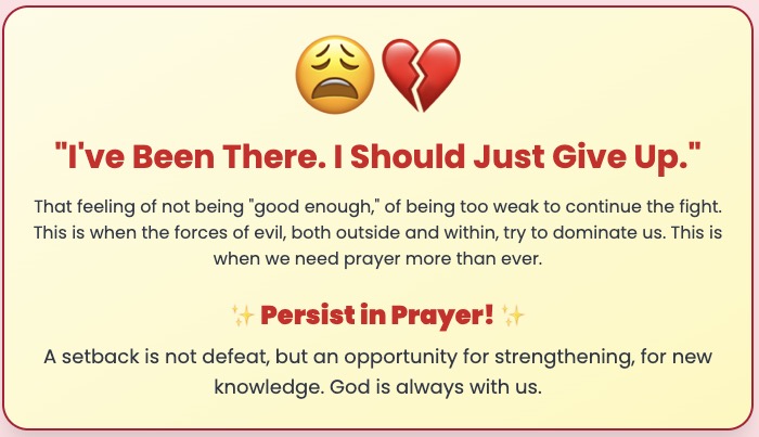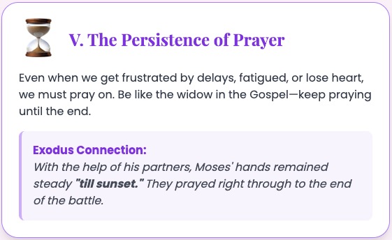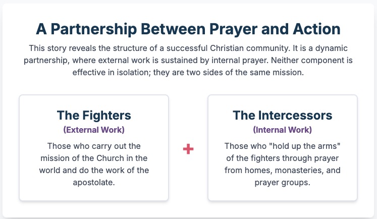 The core message is a call to action: Don’t give in! Instead, remember God’s power and lean on your community—be it your parish or support groups like AA—as your modern-day Aaron and Hur, holding your arms up in prayer when you are too weak. Through persistent prayer and communal support, even the fiercest personal enemies can be overcome.