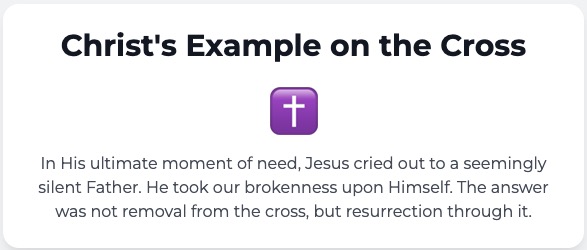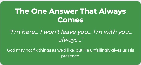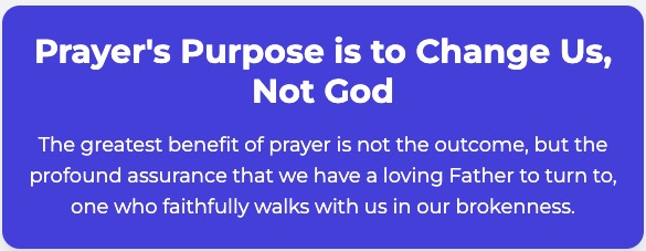 The primary purpose of prayer is not to change God’s mind or get the outcome we want, but to draw us into a deeper relationship with God, who faithfully promises His presence and comfort, especially when walking with us through our brokenness.