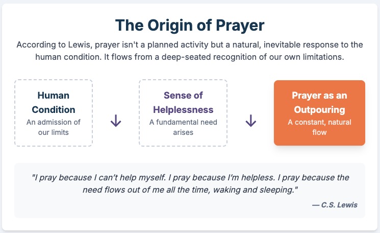 Some of you may remember the movie Shadowlands, a moving tale of the great Christian writer, C. S. Lewis, and his wife Joy. At one point in the film, after finding out that Joy’s cancer had gone into remission, one of Lewis’ friends says to him, “I know how hard you have been praying, and now God is answering your prayer.” Lewis, brilliantly played by Anthony Hopkins, replies, “That’s not why I pray, Harry. I pray because I can’t help myself. I pray because I’m helpless. I pray because the need flows out of me all the time, waking and sleeping. It doesn’t change God. It changes me.”