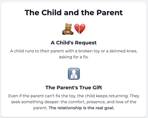 Sometimes it is easy to feel that praying for things is not quite the best way to pray. Sometimes we can feel that asking God for things is somehow immature. It may be that if we keep asking God for things, we will always remain like little children, unable to take responsibility for ourselves as adults. As a child, I often remember being told that God was not like a coin-in-the-slot machine. It was a temptation to treat God like that: we put the prayer-coin in the slot, and out comes the answer to our prayer, almost automatically. But that was a bad way to treat God, I was told. We must resist the temptation to infantile religion.