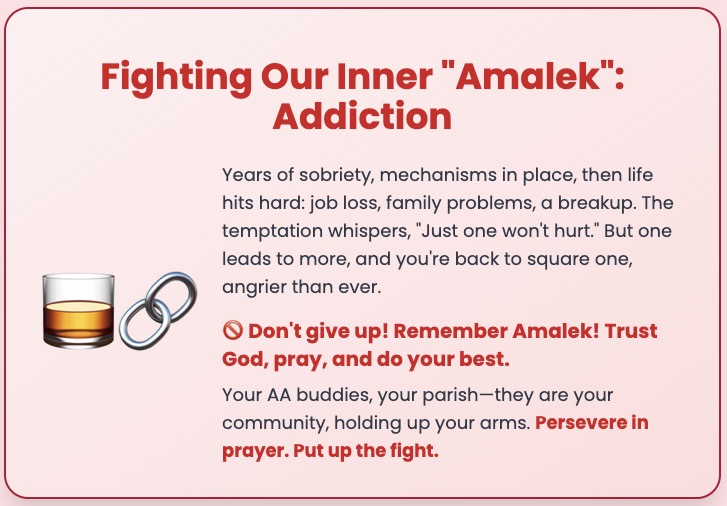 The homily applies this to our modern “inner Amalek,” specifically the recurring struggles with anger and addiction. It acknowledges the profound temptation to give up after a relapse, when we feel we are back at square one and not good enough.