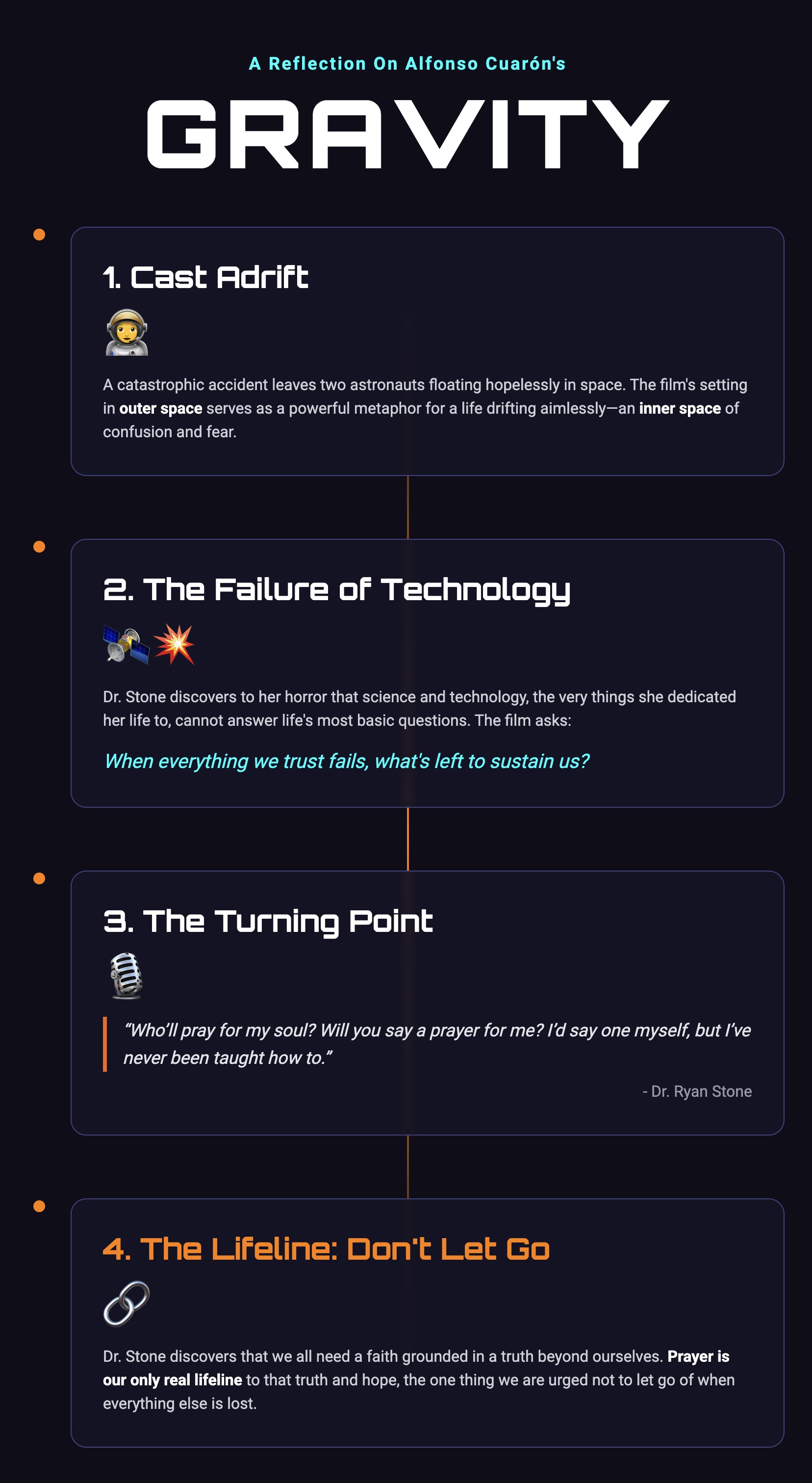 GRAVITY (01:05) – In the film, Gravity, Sandra Bullock’s character, Ryan Stone, finds herself in a desperate situation, stranded all alone in outer space. She is almost certainly about to die. She knows she needs help beyond herself. But she doesn’t know how to ask for it.nce.
