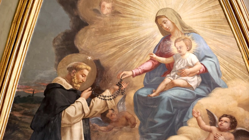 Image: St Dominic receiving the Rosary – painting from the Basilica of Nuestra Señora del Rosario in Cordoba, Argentina, photographed by Fr Lawrence Lew OP