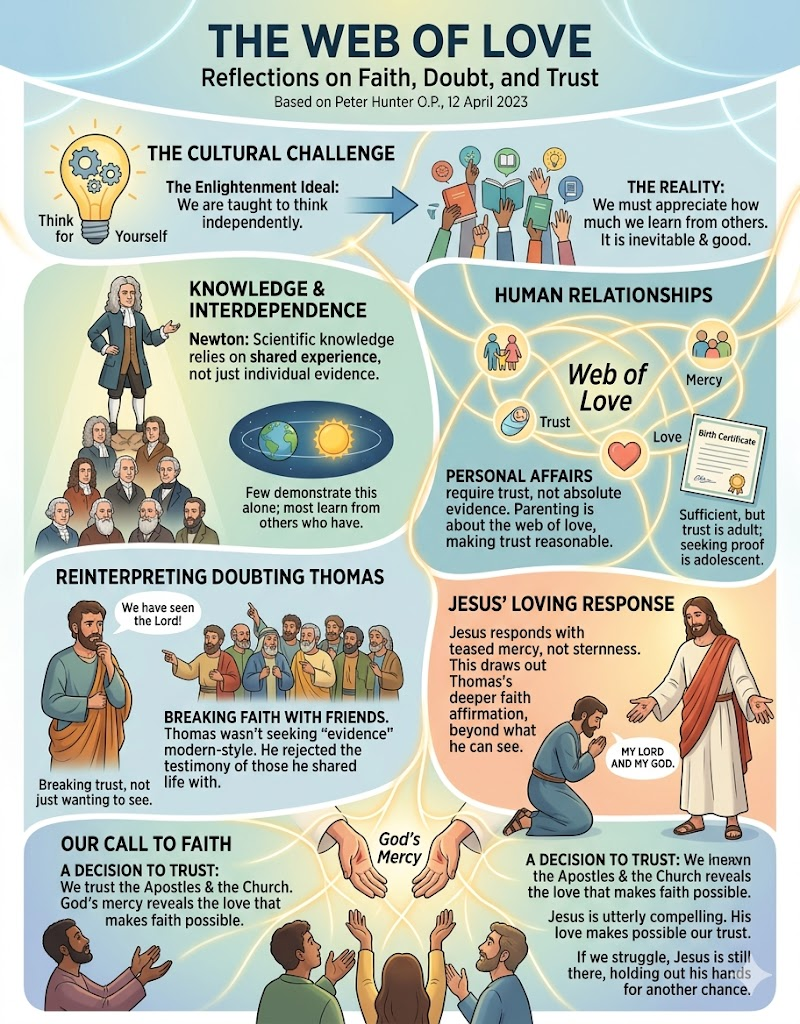Father Peter Hunter, O.P., challenges the modern Western ideal of “thinking for oneself” by highlighting our fundamental dependence on others. He argues that science, personal identity, and human relationships all rely on a “web of love” and trust rather than raw evidence. Thomas’s doubt was not a scientific inquiry but a breakdown of trust in his community. Faith, therefore, is not a conclusion reached in a vacuum but a decision to trust the testimony of the Apostles and the Church. Ultimately, God’s mercy provides the love that makes this trust—and the confession “My Lord and my God”—possible.