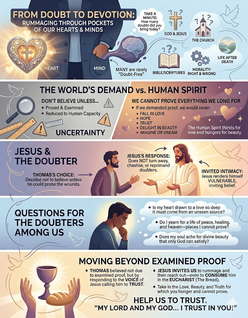 Father Austin Fleming invites the faithful to “rummage through the pockets” of their hearts to acknowledge their doubts regarding God, the Church, and the afterlife. He argues that demanding absolute proof for everything would stifle the human capacity to love, hope, or appreciate beauty. While Thomas initially chose doubt over trust, Jesus responded not with rejection, but with an invitation to deeper intimacy. Ultimately, our persistent hunger for a love and beauty we cannot prove points toward a Divine source. Faith, then, is a response to Christ’s voice calling us to trust beyond our intellectual comprehension.