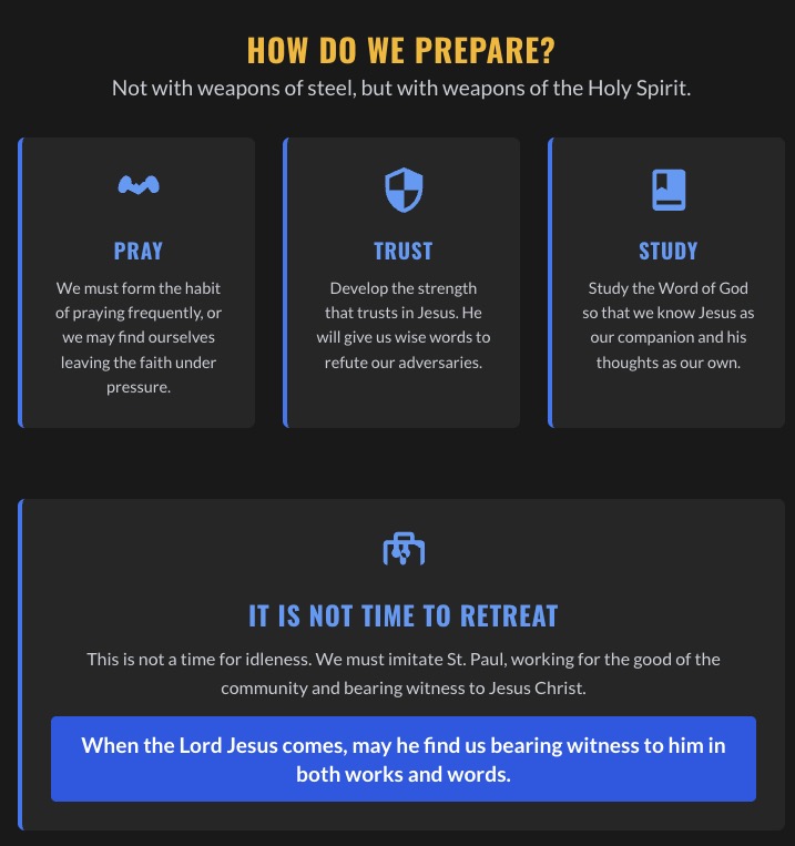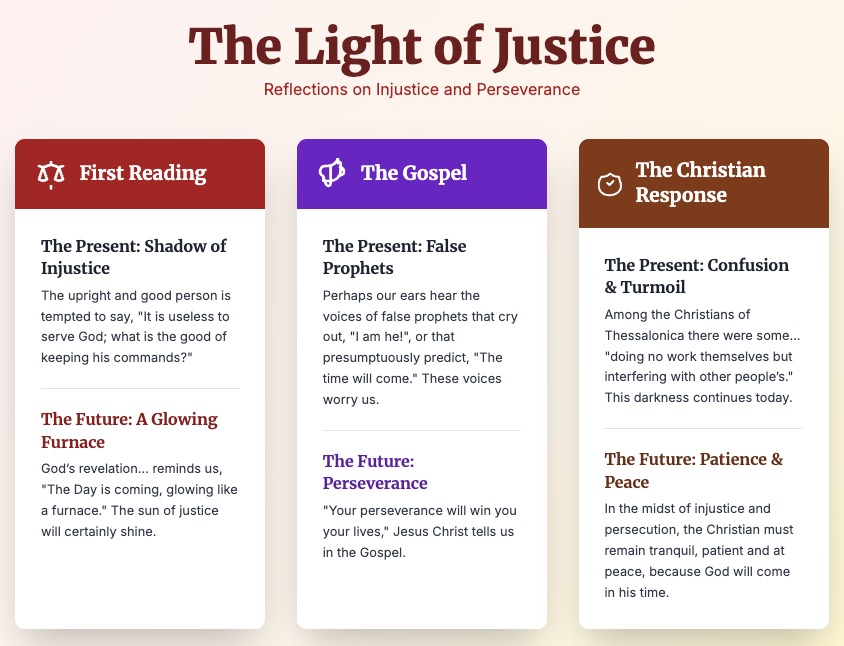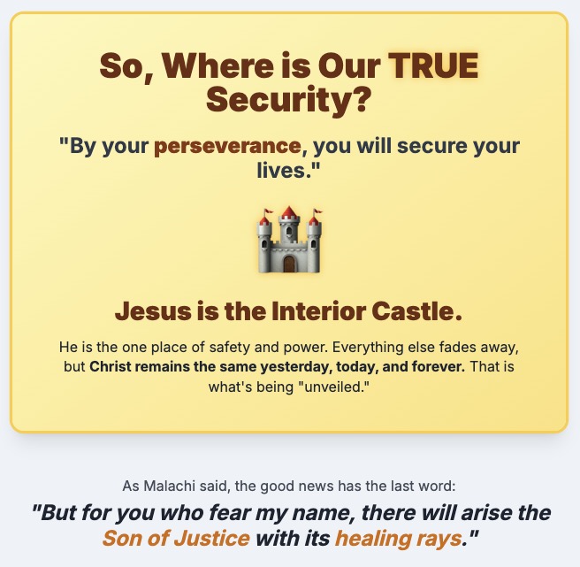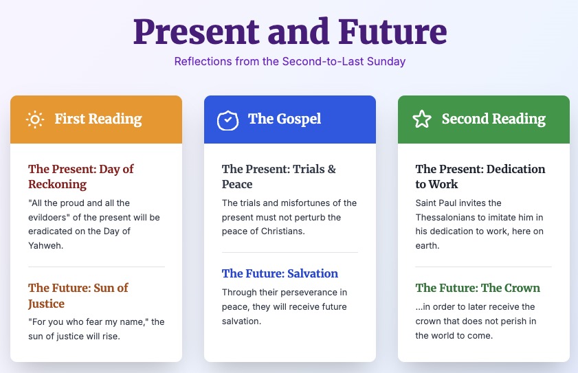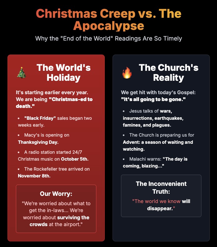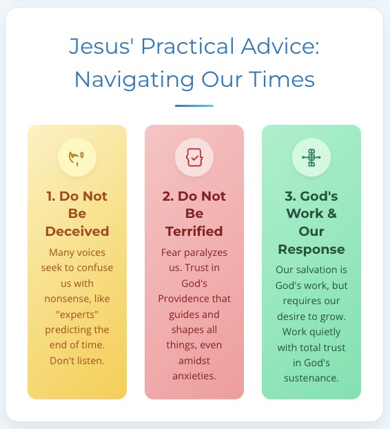 Msgr. Hahn’s homily reflects on the rapid passage of time, urging us to keep eternity in perspective as the “Day of the Lord” approaches. This day is a “destructive blaze” for the proud but a healing “Sun of Justice” for the faithful. To prepare, Jesus offers three tips: “Do not be deceived” by godless voices, “Do not be terrified” by paralyzing fear, and “Relax and trust” in God, who provides wisdom and salvation. Our role is to respond nowโnot with fear, but with the peace and confidence that comes from persevering in faith.