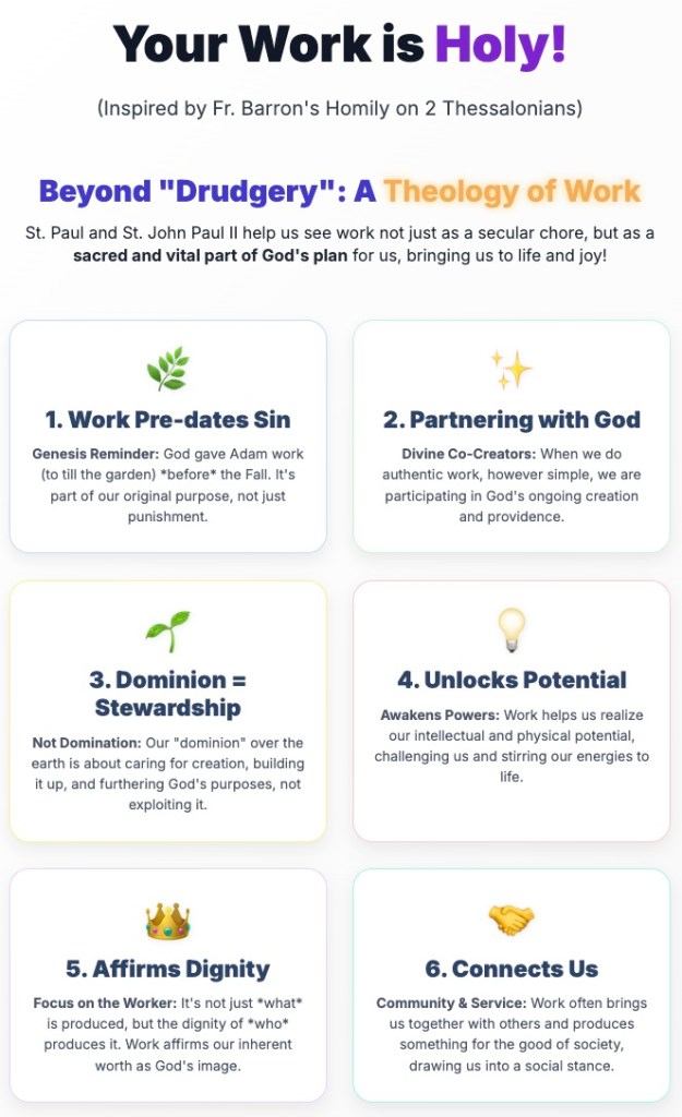 Iโm pretty sure that in thirty years of priesthood, Iโve never preached on this Sundayโs short second reading from Paulโs second letter to the Thessalonians. And what a little gem it is! Isnโt it fascinating that St. Paul, precisely in the context of a letter to his church on spiritual matters, endeavors to speak of work? When we do authentic workโof whatever kindโwe participate in Godโs ongoing creation and providence. Donโt follow the instinct to secularize work; rather, see your daily labor, however humble, as part of Godโs plan to bring you to joy.