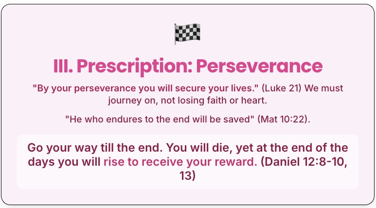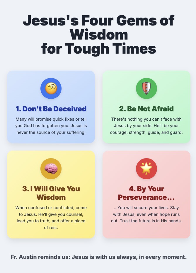 In response to our fears, Jesus offers four “precious jewels” of advice: “Don’t be deceived,” “Be not afraid,” “I will give you wisdom,” and “By your perseverance, you will secure your lives.” The homily urges us to bring our burdens to the altar, where Christ gives us the courage, wisdom, and hope to live one day at a time.