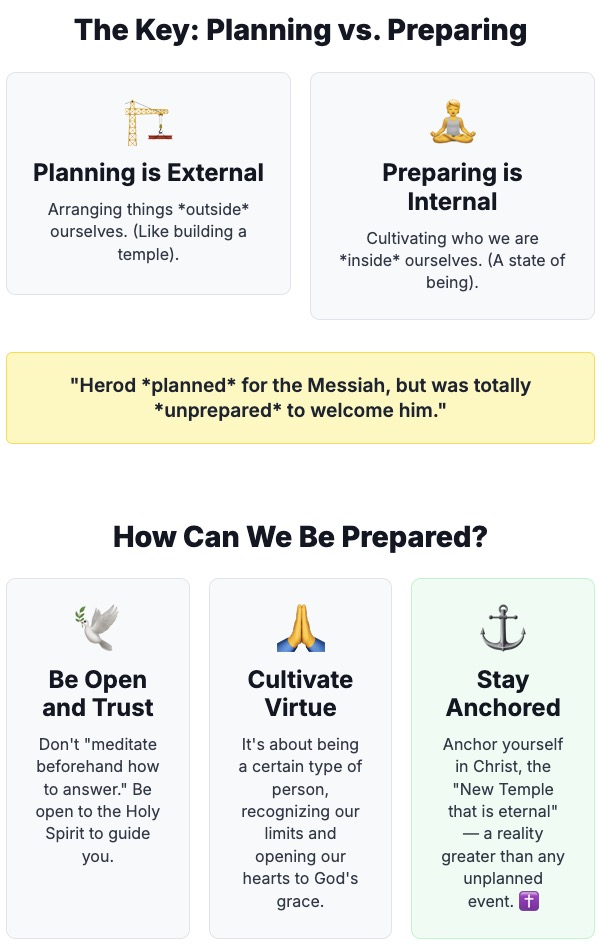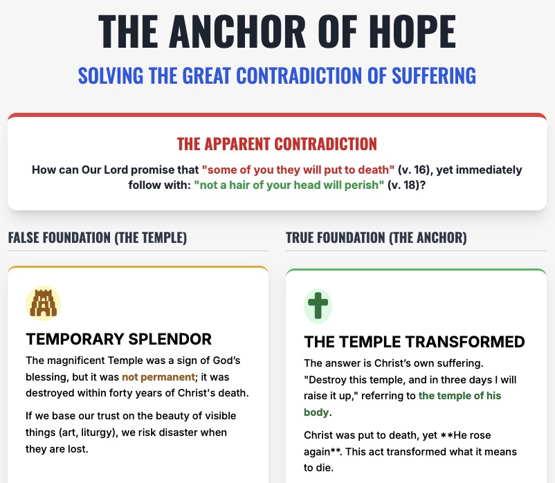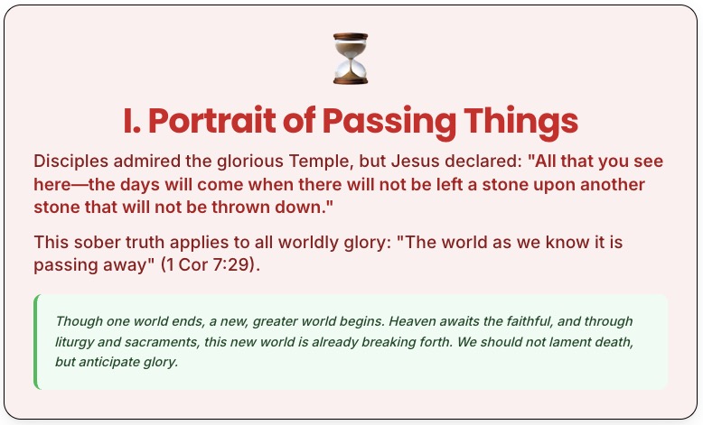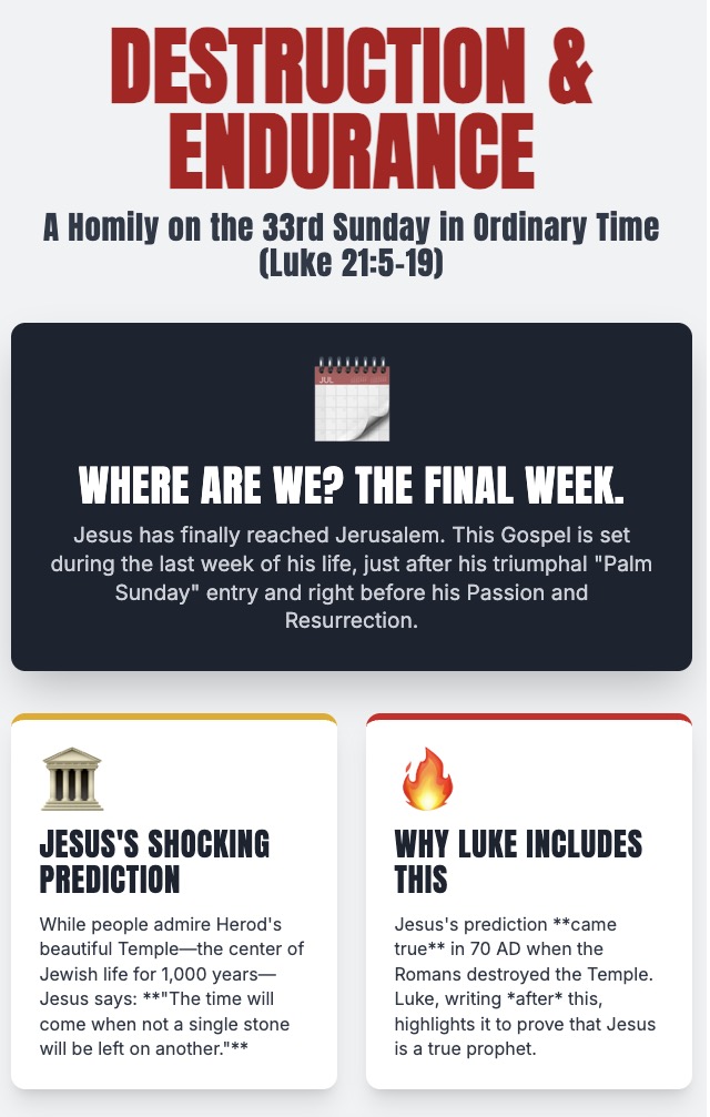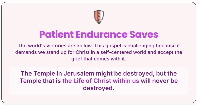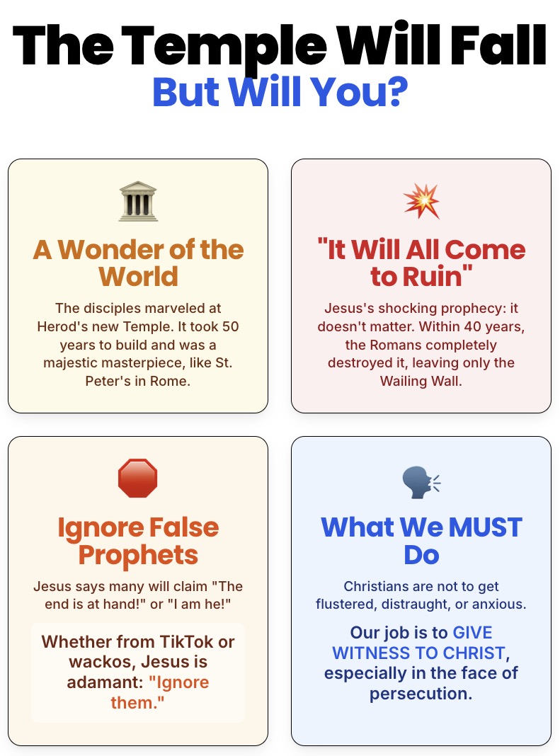 Msgr. Pellegrinoโs homily contrasts the magnificent-but-temporary Temple with the eternal. Jesus prophesied the Temple’s destruction, warning us not to be distracted by false prophets or end-times anxiety. Instead of being flustered, our true calling is to “give witness to Christ,” even in the face of persecution. This “patient endurance” is martyrdomโthe “witness” we are all called to. This may mean facing scorn for upholding family values or choosing Christ over financial or personal convenience. While the world’s victories are hollow, our patient endurance, our witness, builds the indestructible temple of Christ within us.