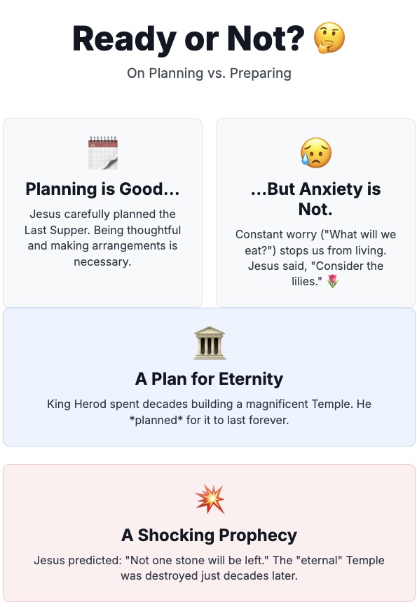 One could interpret what Jesus is saying in todayโs Gospel as Jesus helping the people to plan for future events that he foresaw but they did not: the impending catastrophe about to descend on the Jewish People and the persecution of the early Church. But Jesus also has a perennial message, a simple but important message: we can plan as much as we like โ it can be good to plan โ but we also need to be prepared for whatever life might throw at us in the future, including what is wholly unexpected and unplanned.