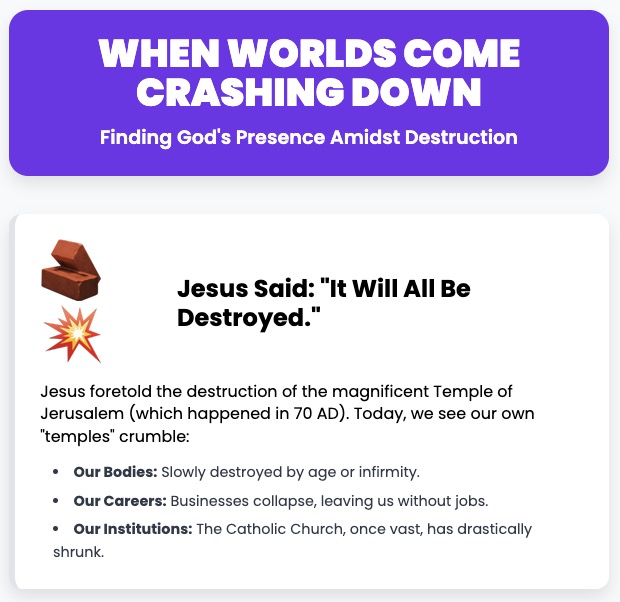 In his homily, Fr. Austin explains that Jesus’s prophecies of destruction and persecution are not just a “crystal ball” for the future but a “magnifying lens” for our present-day troubles. We still face wars, plagues, and personal calamities.
