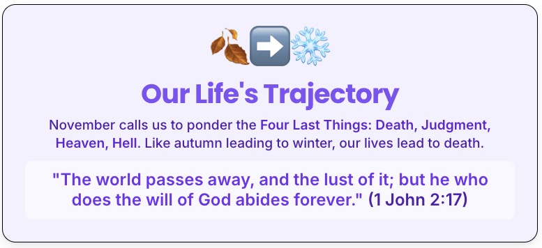 During the month of November, the Church has us ponder the Four Last Things: death, judgment, Heaven, and Hell… In todayโs Gospel, the Lord Jesus gives us a kind of road map of life and calls us to be sober about the passing and perilous nature of this world.
