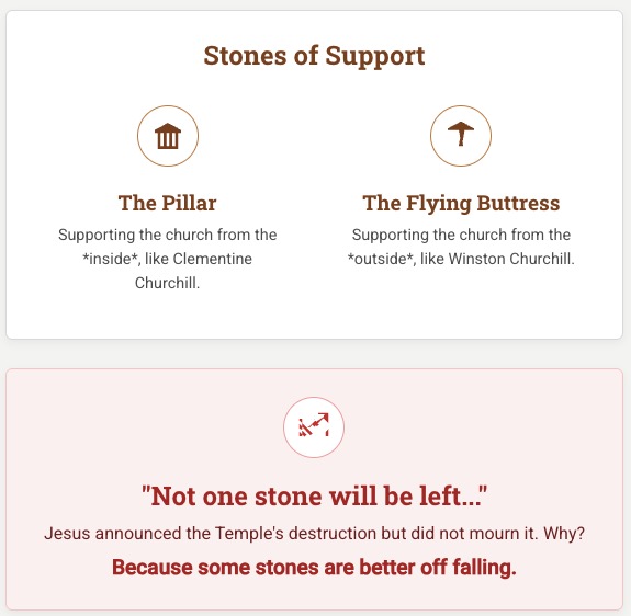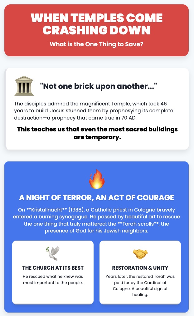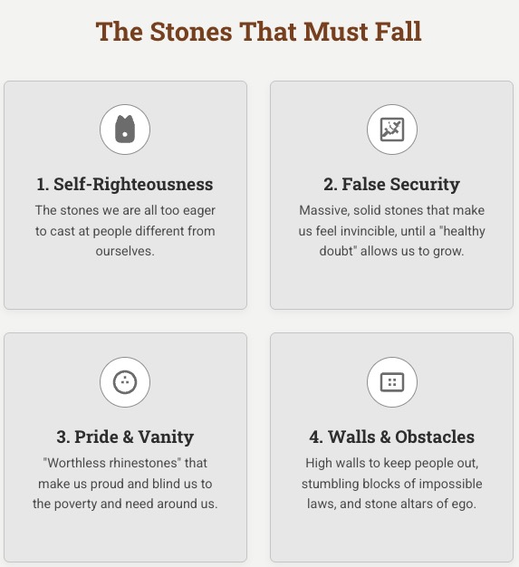 Fr. Kevin’s homily uses the metaphor of “stones” to explore personal and institutional faults. While we see ourselves as “pillars” supporting the church, Jesus’s prophecy that the Temple’s stones would fall suggests some stones should fall. The “stones” in our own soulsโsuch as self-righteousness, false security, pride, and walls that exclude othersโmust be destroyed. It is well that these “altars of ego” fall. By letting them crumble, we can transform these fallen stones. Stumbling blocks can become stepping stones and fallen walls can become bridges, allowing us to rebuild ourselves from our brokenness into true temples of God’s love.