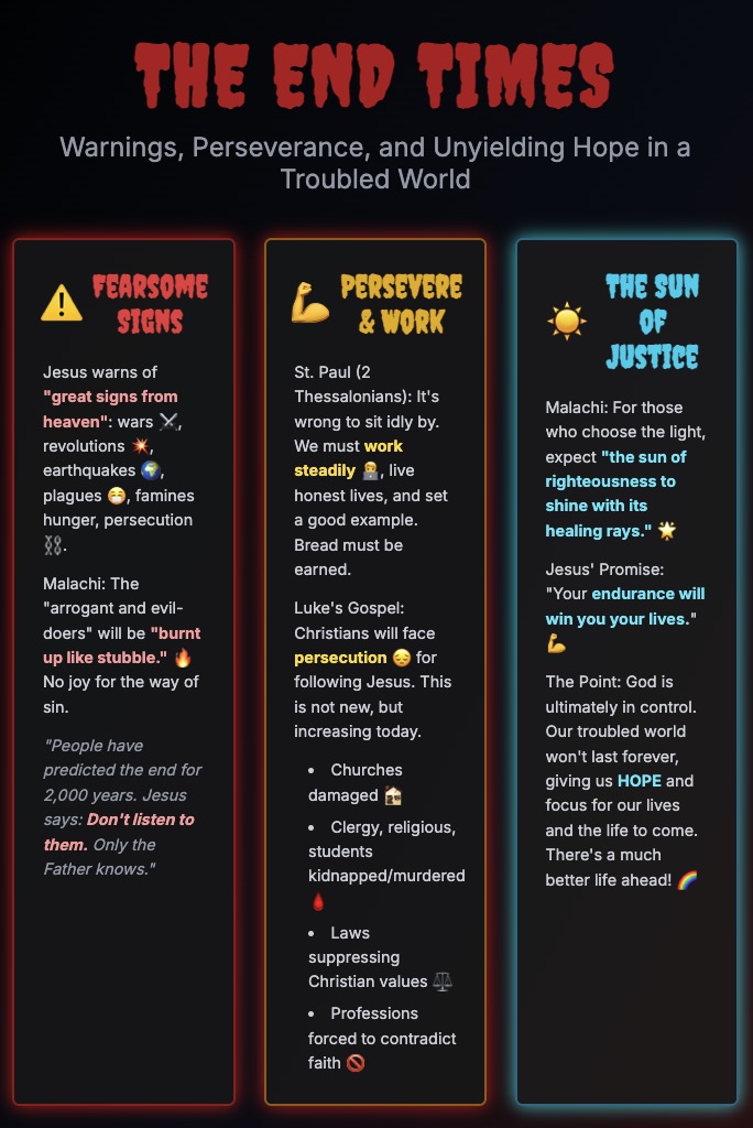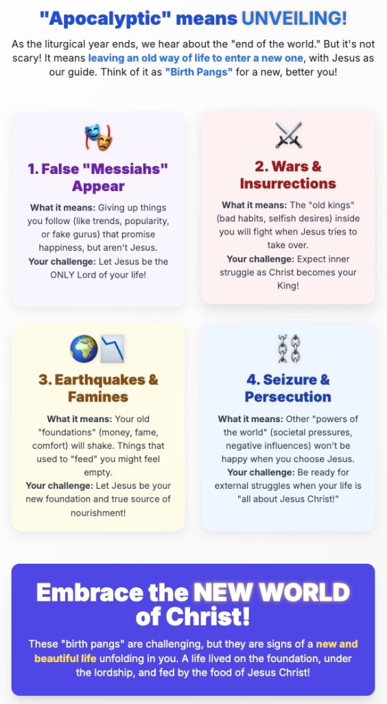 Christ will return in glory at the end of time to judge the living and the dead. There will be a resurrection of the body, and Godโs justice and mercy will be fully revealed. This is the true meaning of the end of the worldโnot fear of cosmic disaster but confident hope in the ultimate triumph of our Lord Jesus Christ. Rather than becoming preoccupied with signs and speculations, Catholics are called to live in a state of grace, anchored in the sacraments, guided by Sacred Scripture, and sustained by the theological virtues of faith, hope, and love. We do not need to fear the end. We belong to a Church that already knows how the story ends: Christ is victorious as He was โin the beginning, is now and ever shall be, world without end. Amen.โ